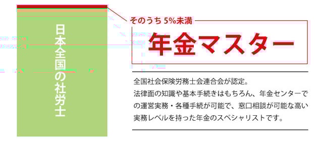 当センターで手続きに従事するのは「社会保険労務士」の中でも5%未満しか保有していない年金上位資格「年金マスター」を取得した社労士が中心となっております。